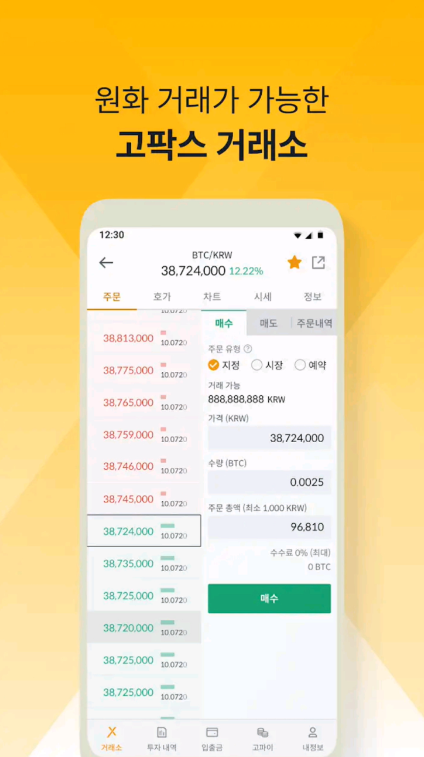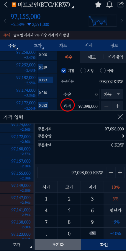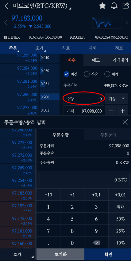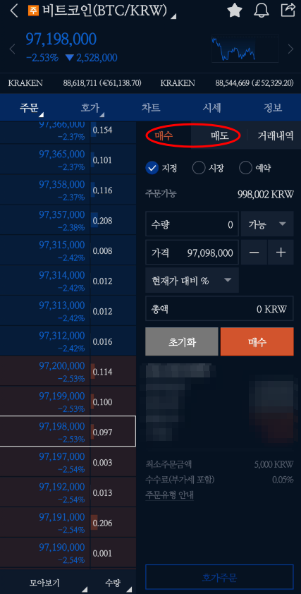 [매수/매도] 탭에서 원하는 가격 및 수량을 지정 후 각 [매수] 또는 [매도] 클릭