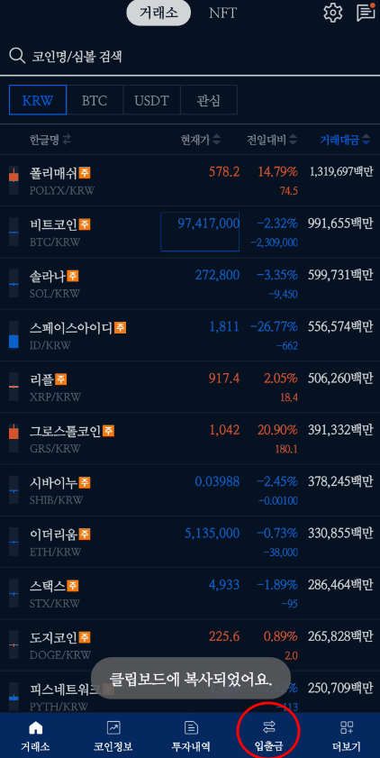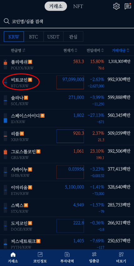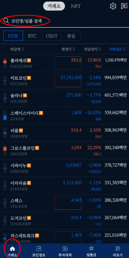 2) [거래소] 탭 선택 후 [코인명/심볼 검색]에서 원하는 코인을 검색