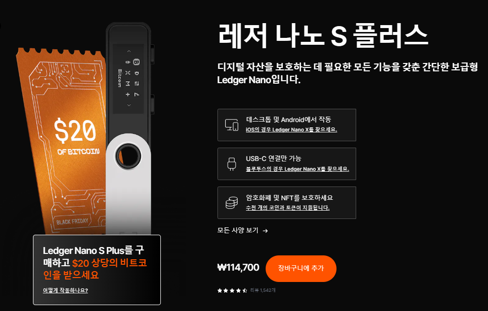 렛저 나노 S 플러스 구매 시 $20 상당 비트코인 지급