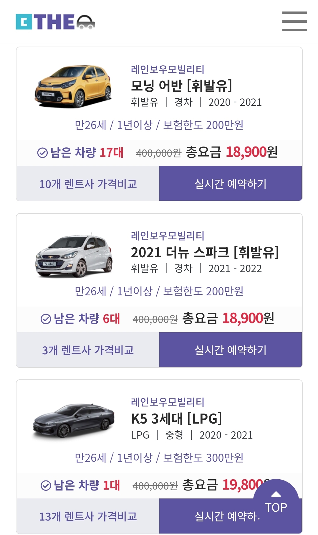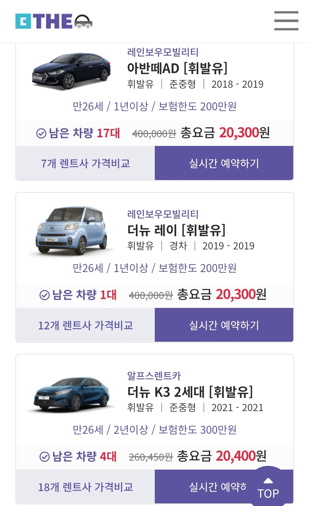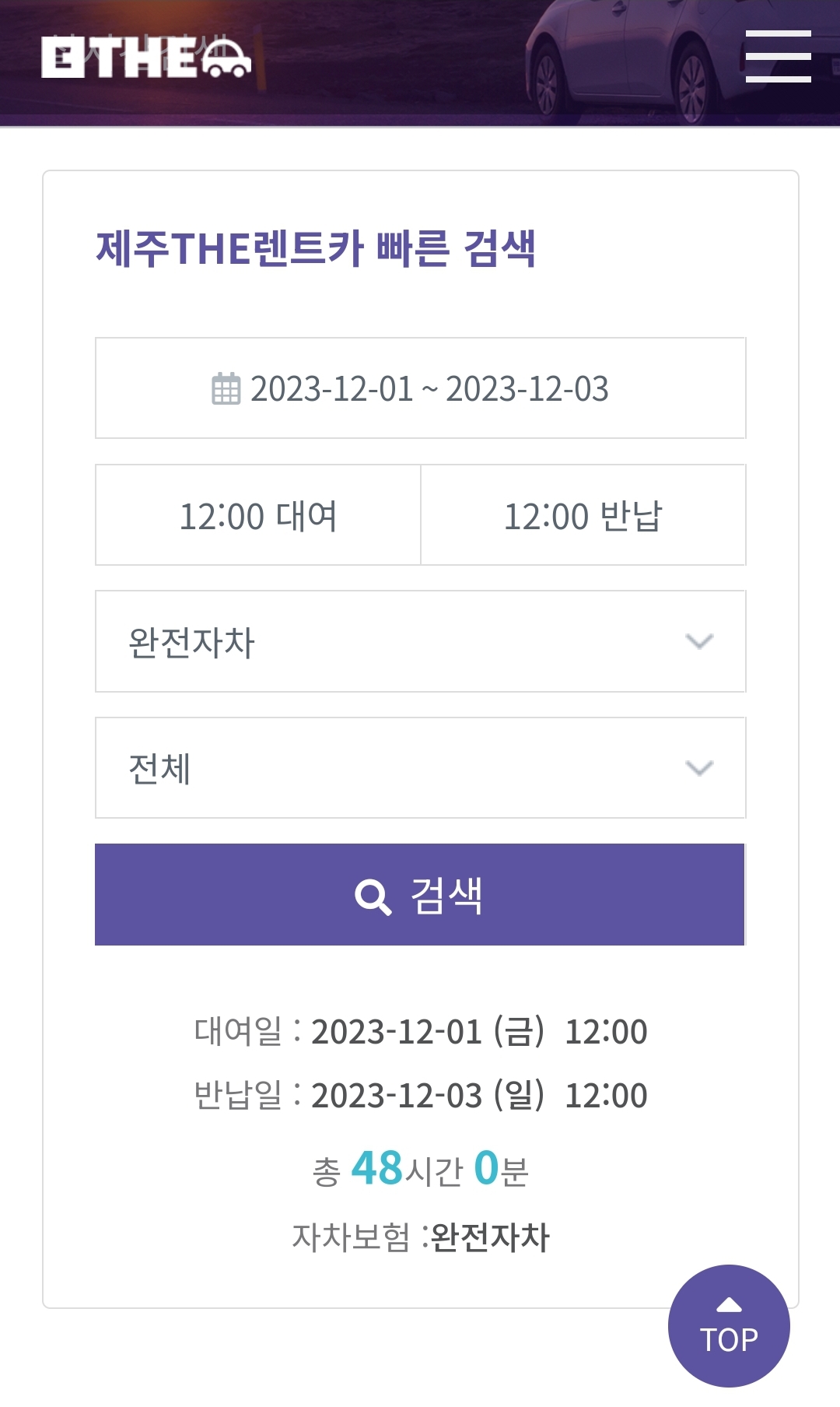 첫 번째에 안내드렸던 [제주THE렌트카]에서 가격비교 해보시고, 원하는 차량이 없을 경우에는 [제주엔젤렌트카]에서 원하시는 차종으로 검색하셔서 합리적인 가격으로 렌트하시길 바랍니다.
